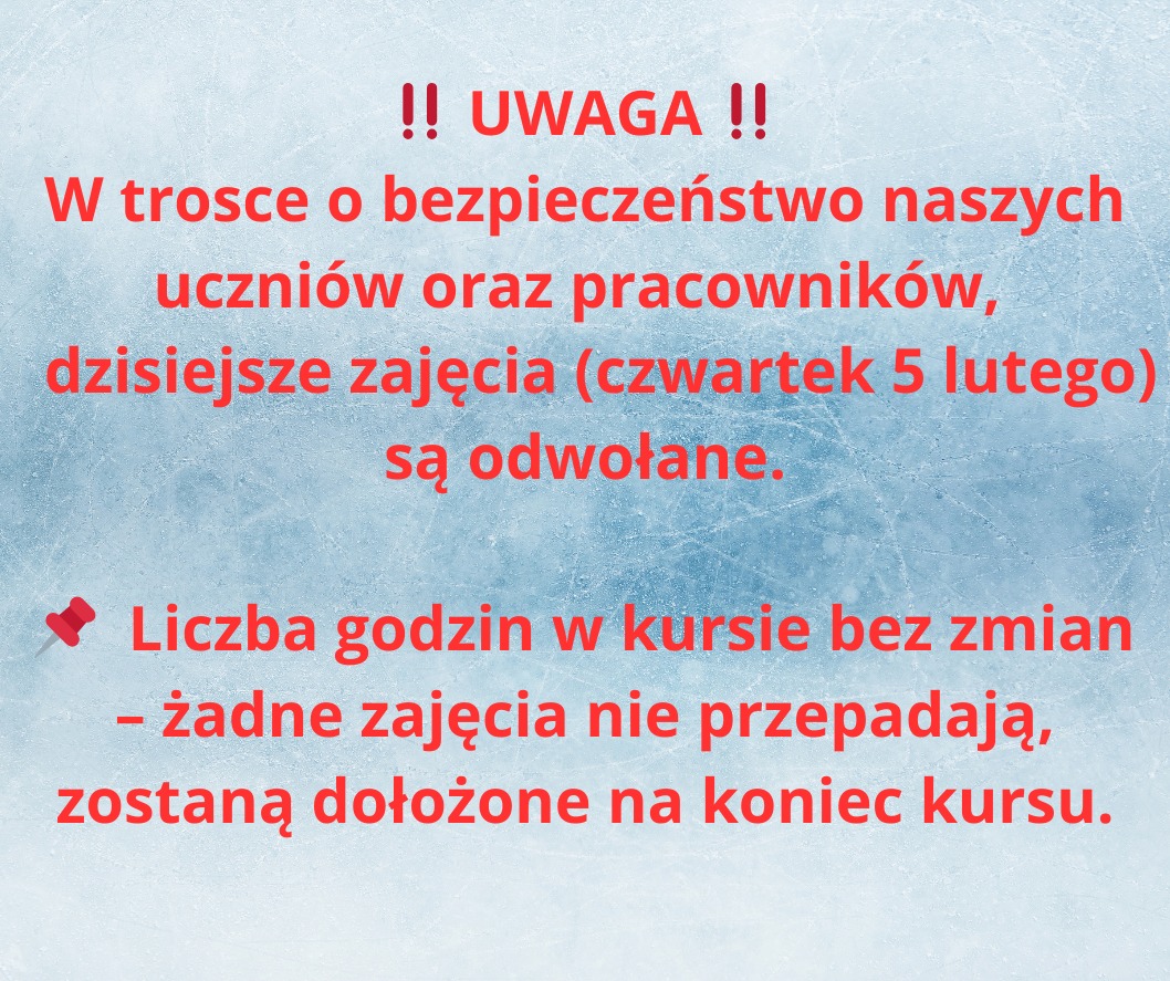 Liczba godzin kursu pozostaje bez zmian, a odwołane lekcje zostaną odrobione w późniejszym terminie i doliczone na końcu kursu.